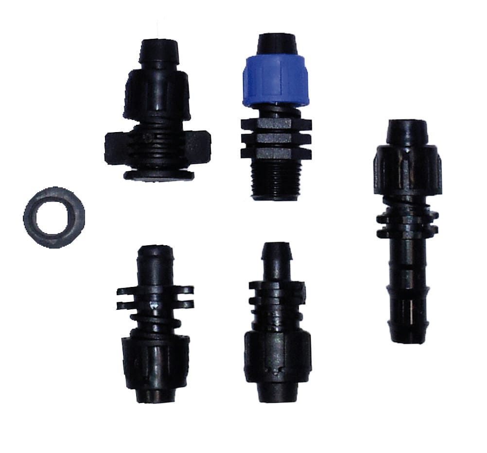 Voor het aansluiten van dunwandige irrigatie slangen zoals de Streamline X ReGen levert Netafim een breed pakket schroef connectors en bevat o.a.: verbinders, schroefdraad aansluiting, PE aansluiting, eindstop, layflat starter en grommet.