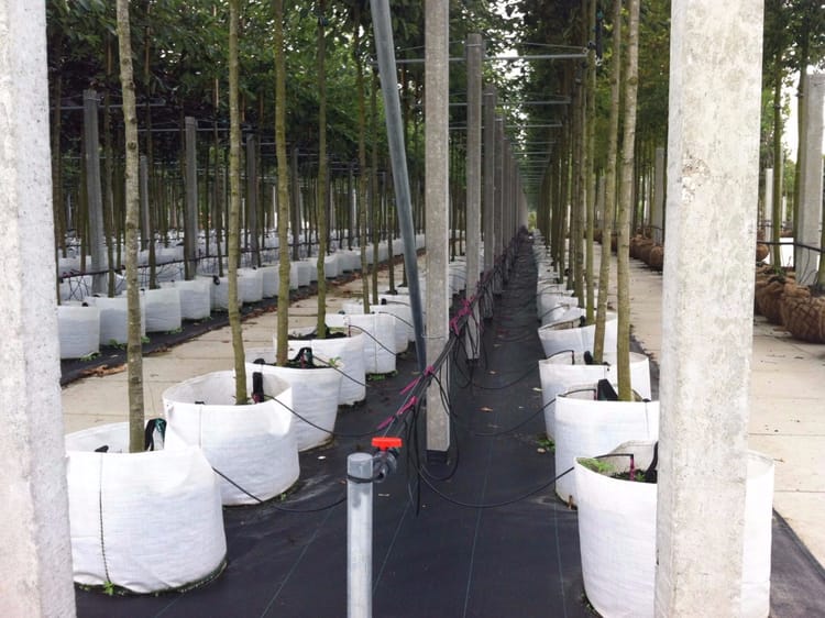 Laanbomen kunnen geteeld worden in de vollegrond en in potten/containers. Kijkend naar de containerteelt is er meer dan 150 hectare in Nederland. Er wordt geteeld in potgrond dat vaak bestaat uit een combinatie van kokos en veen. De Nederlandse kwekers verkopen de producten over de gehele wereld. Doordat kwekerijen beschikken over een groot aantal diverse rassen is het belangrijk om te kijken hoe de bomen zich ontwikkelen. Naast de juiste snoeiwijze is voeding en irrigatie van belang. Haspels zijn minder geschikt, omdat de uniformiteit dan minder is. Druppelbevloeiing is hét perfecte irrigatiesysteem hiervoor. Door verschillende kraanvakken kan elk ras de benodigde voeding krijgen en zullen dezelfde rassen tot op de druppel nauwkeurig dezelfde hoeveelheid water krijgen. Dit systeem realiseert een hoge uniformiteit. Netafim biedt deze mogelijkheid en blijft zelf innoveren door middel van kennisoverdracht, zodat uniformiteit en precisie op nummer één komen te staan.